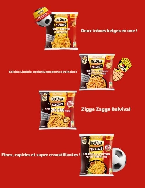 Pour célébrer notre esprit de supporters Bon Vivants, Belviva lance de nouvelles icônes belges en forme de frites : les Belviva Specials ! Découvrez Belviva Gaufrites et Frites goût Bière. Le meilleur de la Belgique, tout croustillant dans l’assiette.